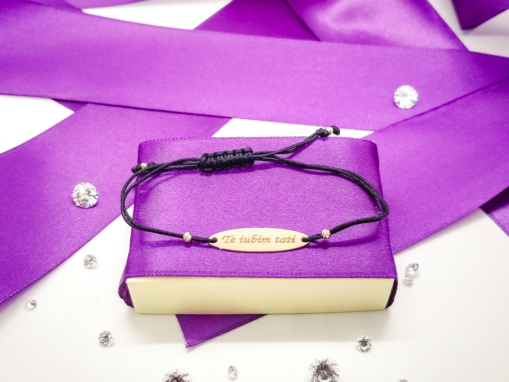 Bratara FATI 182 din aur galben de 14K cu snur negru model Oval cu Mesaj. Toate Bijuteriile LaBeruzi sunt insotite de certificate de garantie, care atesta calitatea metalului si a pietrelor pretioase. Pentru fiecare comanda online va oferim BON FISCAL, ambalarea cadou.
