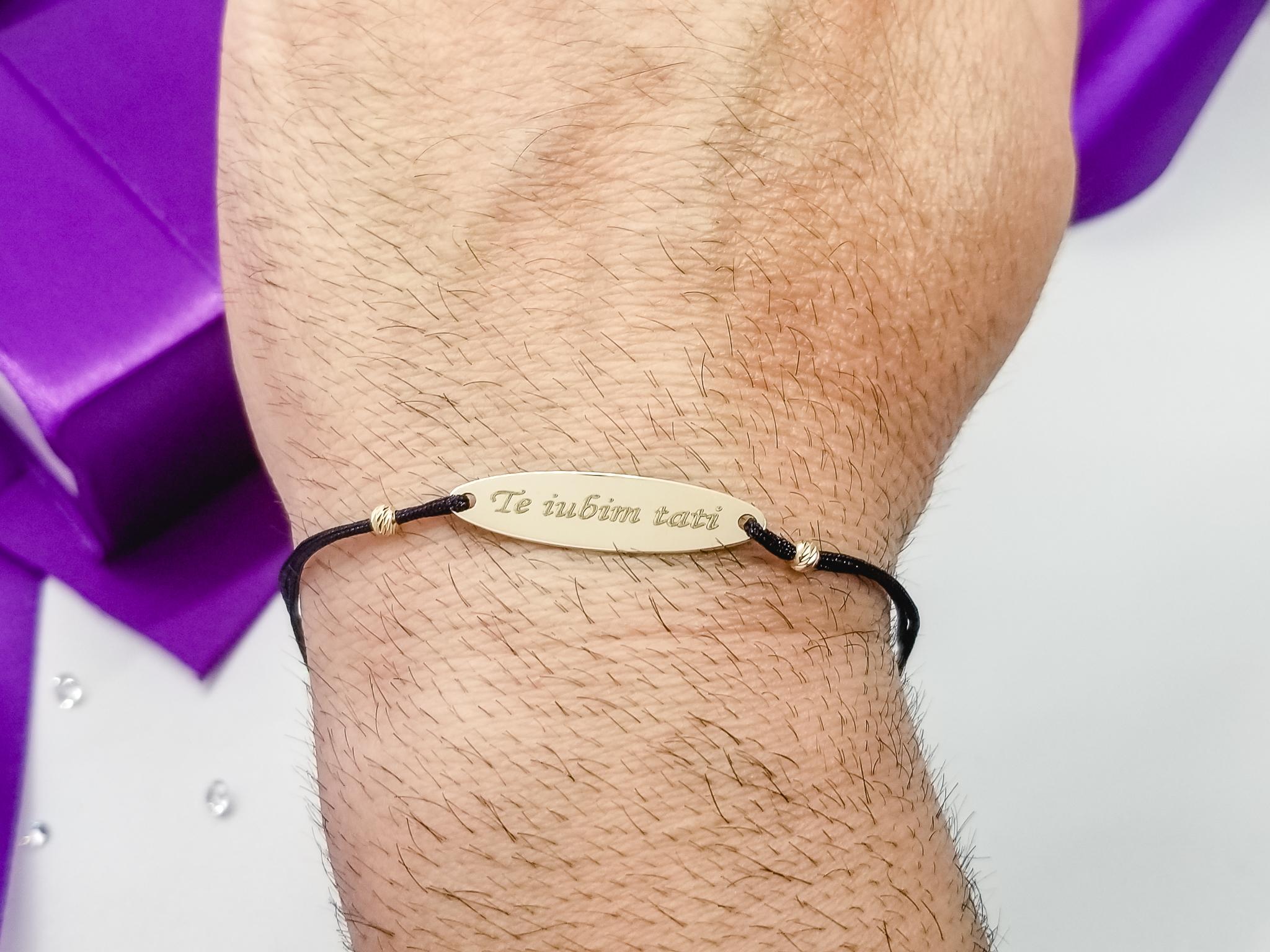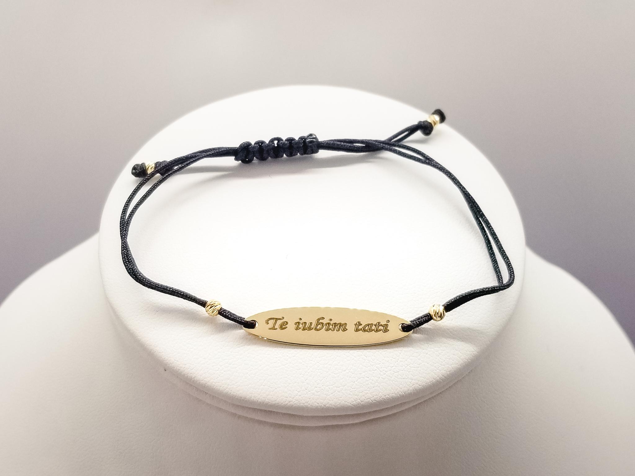 Bratara FATI 182 din aur galben de 14K cu snur negru model Oval cu Mesaj. Toate Bijuteriile LaBeruzi sunt insotite de certificate de garantie, care atesta calitatea metalului si a pietrelor pretioase. Pentru fiecare comanda online va oferim BON FISCAL, ambalarea cadou.